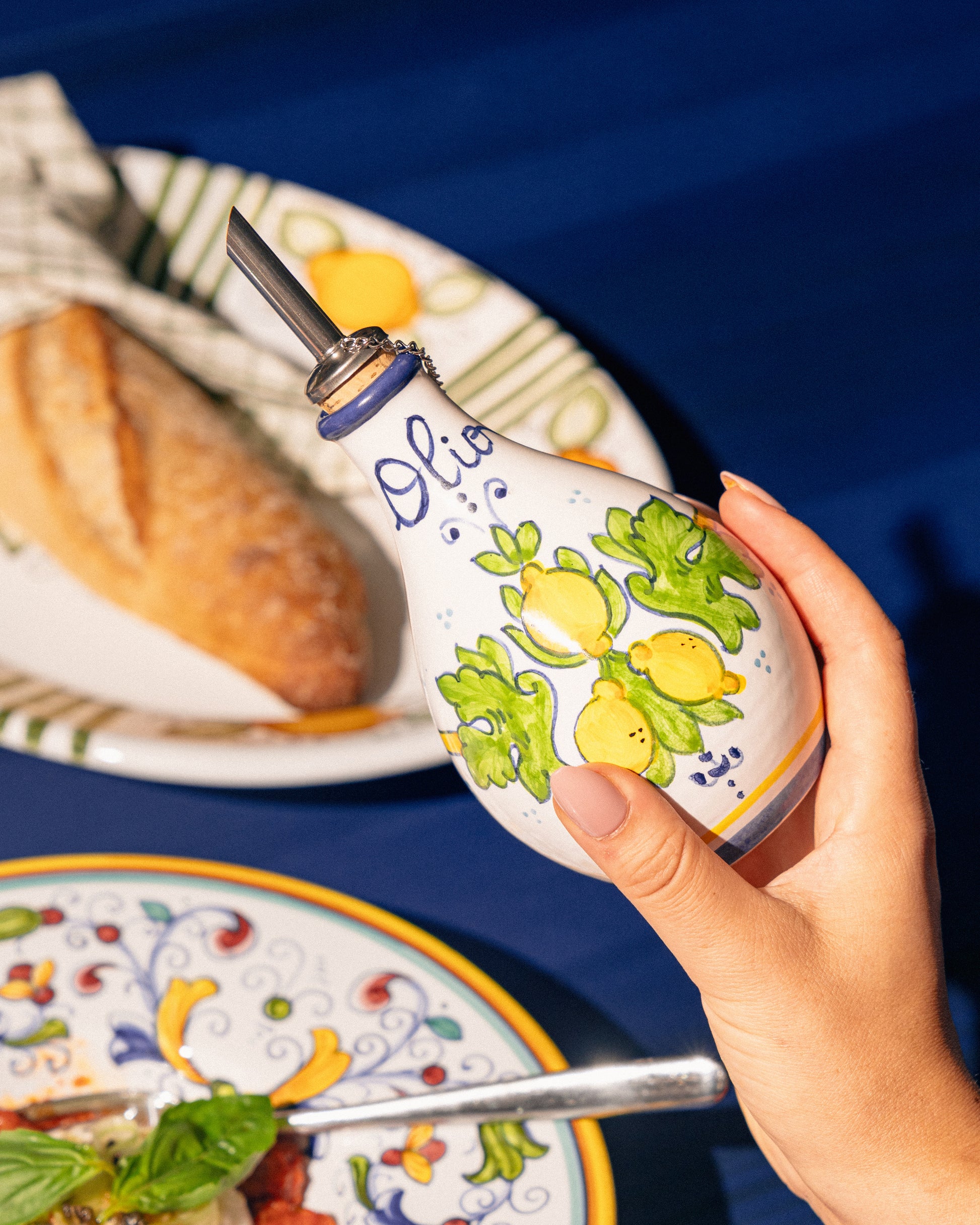 Denna handmålade olivoljeflaska på 18 cm från Basta Home ger en unik och stilfull känsla till din matlagning och dukning. Varje flaska är unik och bär med sig konstnärlig skönhet och kvalitet. Välj mellan två eleganta färger. Material: Lergods.
