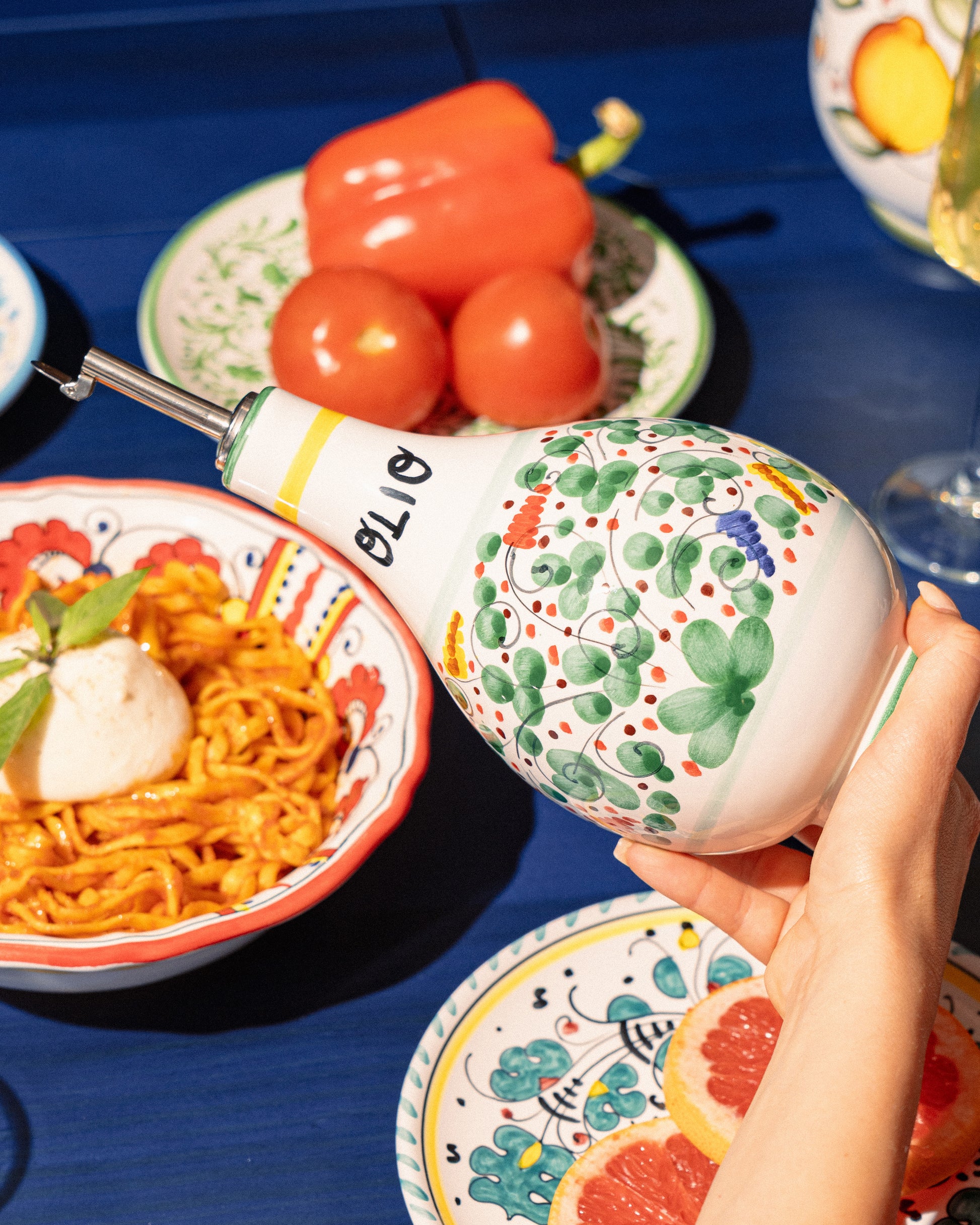 Vår handmålade olivoljeflaska på 25 cm finns i sex färgalternativ och utgör en konstnärlig touch till ditt kök. Dessa flaskor ger en känsla av unikhet och stil till din matlagning och dukning.